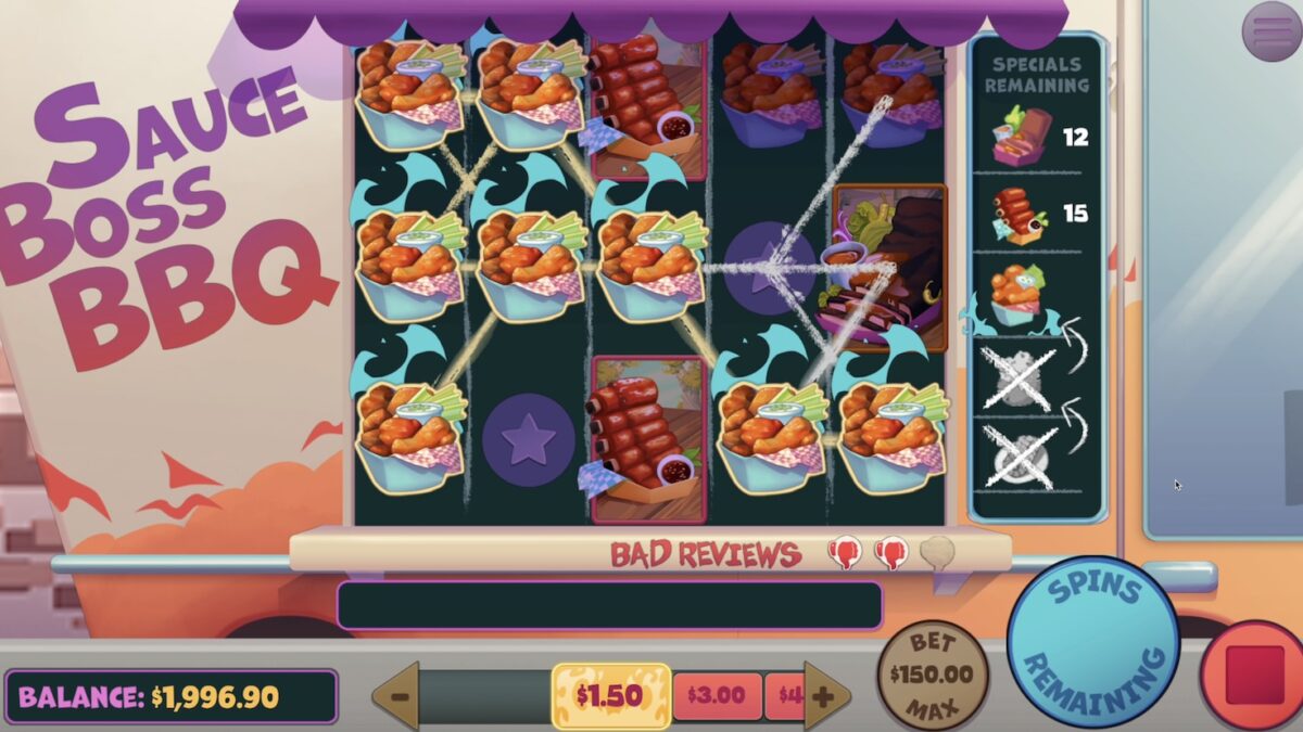 Sauce Boss BBQ doesn’t have a bonus round, but if you can “sell out” most of the featured items, the symbol boosting element discussed above really starts to kick in. So much so that regular gameplay effectively turns into a bonus round. During one of my early tests of the game, I expired all of the remaining featured items and each spin was winning $20+ off a $1.50 wager. This continued until I hit a third 1-star review and the counters reset.