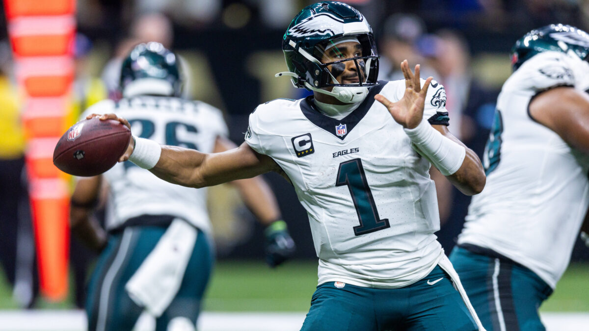 Sep 22, 2024; New Orleans, Louisiana, USA; Philadelphia Eagles quarterback Jalen Hurts (1) passes against the New Orleans Saints during the first half at Caesars Superdome. Mandatory Credit: Stephen Lew-Imagn Images