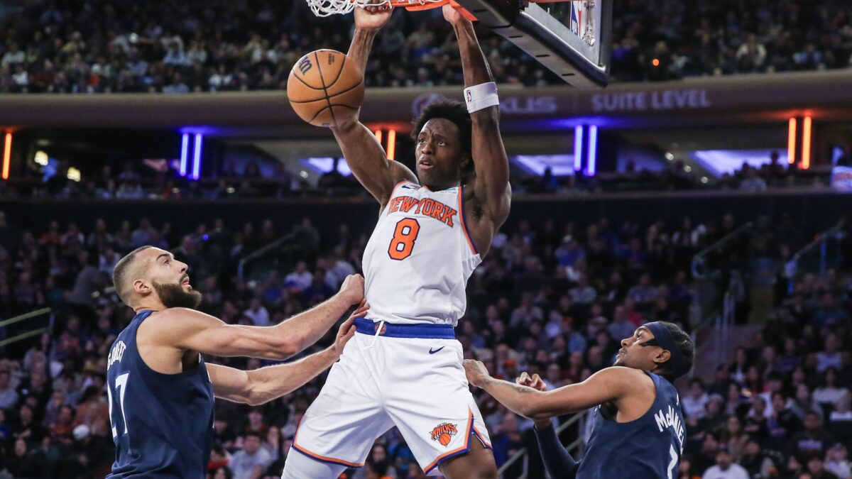 Jan 1, 2024; New York, New York, USA; New York Knicks forward OG Anunoby (8) dunks past Minnesota Timberwolves center Rudy Gobert (27) in the third quarter at Madison Square Garden. Mandatory Credit: Wendell Cruz-USA TODAY Sports
